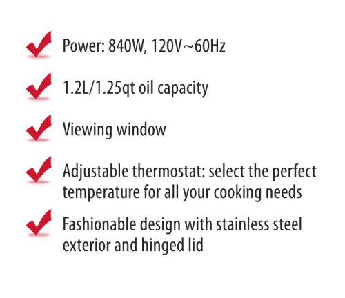 - 1.25qt oil capacity- Adjustable thermostat; select the perfect temperature for all your cooking needs