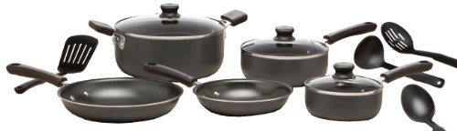12 piece set includes: 8" & 10" saut pans, 1 Qt. & 2 Qt. Covered sauce pans, 5 Qt. covered Dutch oven and 4 utensilsDistinctive cookware for the discriminating cookAluminum construction, riveted stay cool handles.Both nonstick interiors and exteriors for ease in food release and cleanup.Tempered glass covers provide convenient viewing of cooking progress.
