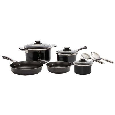 WearEver Authenic Hard Enamel 10-piece Cookset includes 1-Qt. Saucepan with Glass Cover, 2-Qt. Saucepan with Glass Cover, 5-Qt. Saucepan with Glass Cover, 8" Saute & 10" Saute Pans, 2 tools. Durable porcelain enamel exterior resists scratches; Metal utensil safe nonstick interior; Black and Stainless phenolic handles stay cool on the stovetop; See through glass covers with wide stainless accents; Dishwasher safe for convenient cleaning.